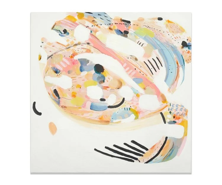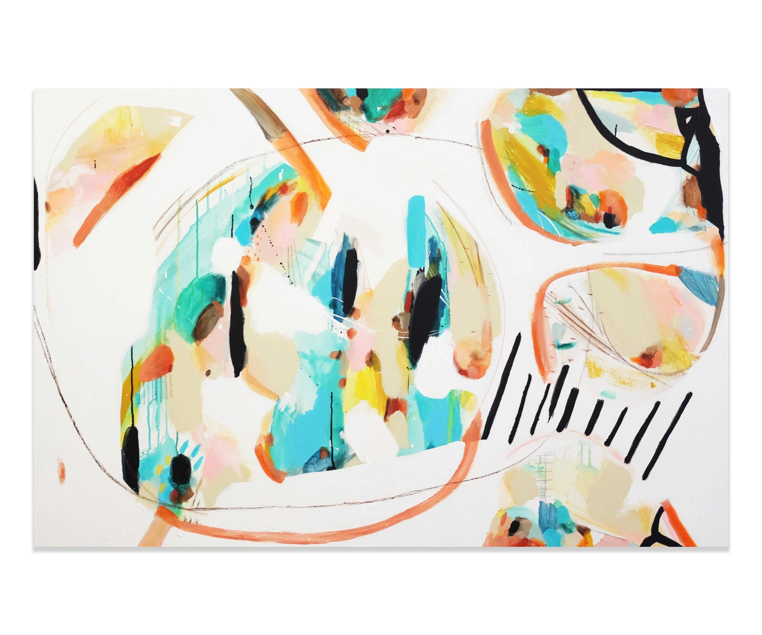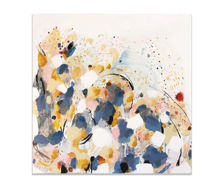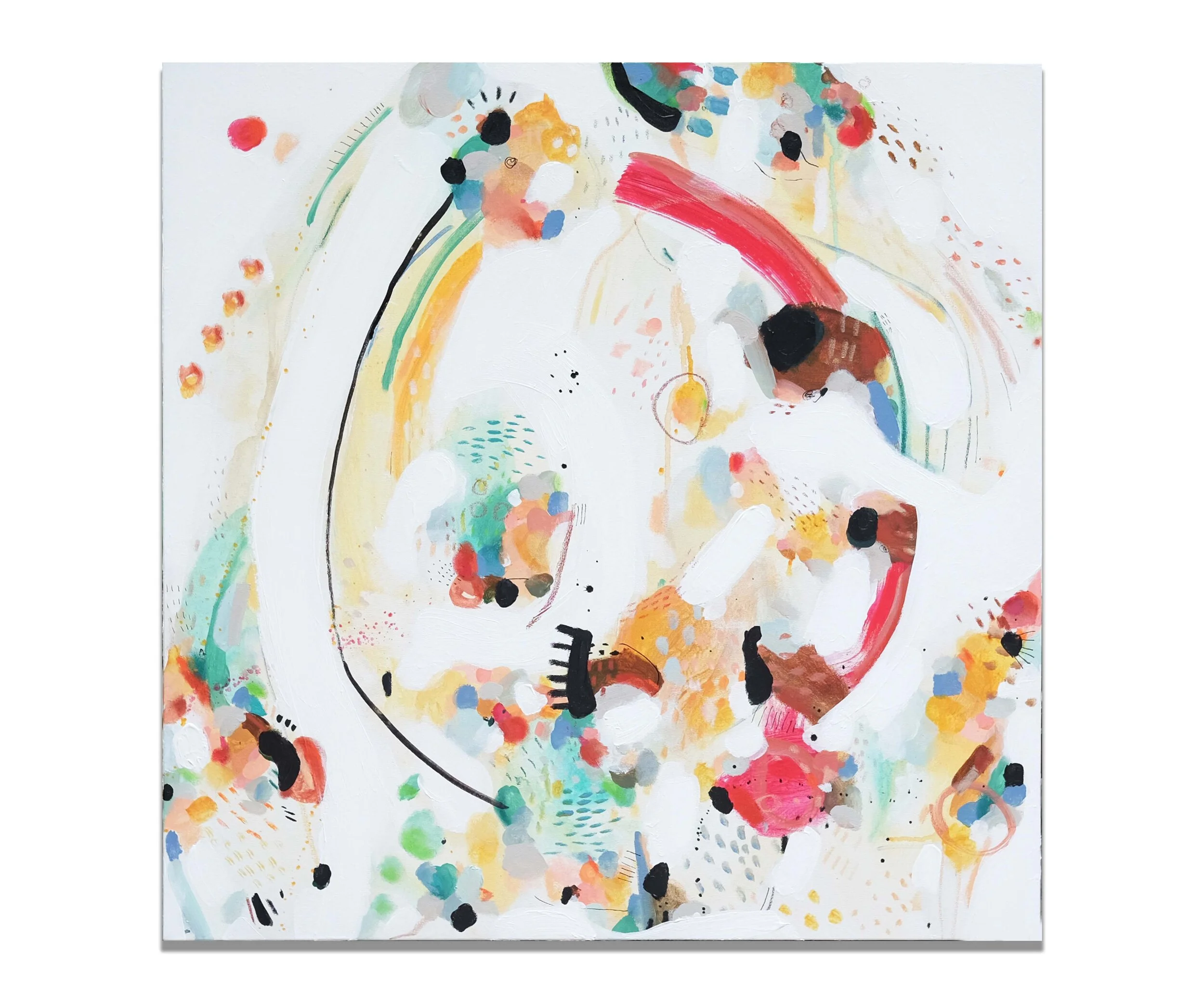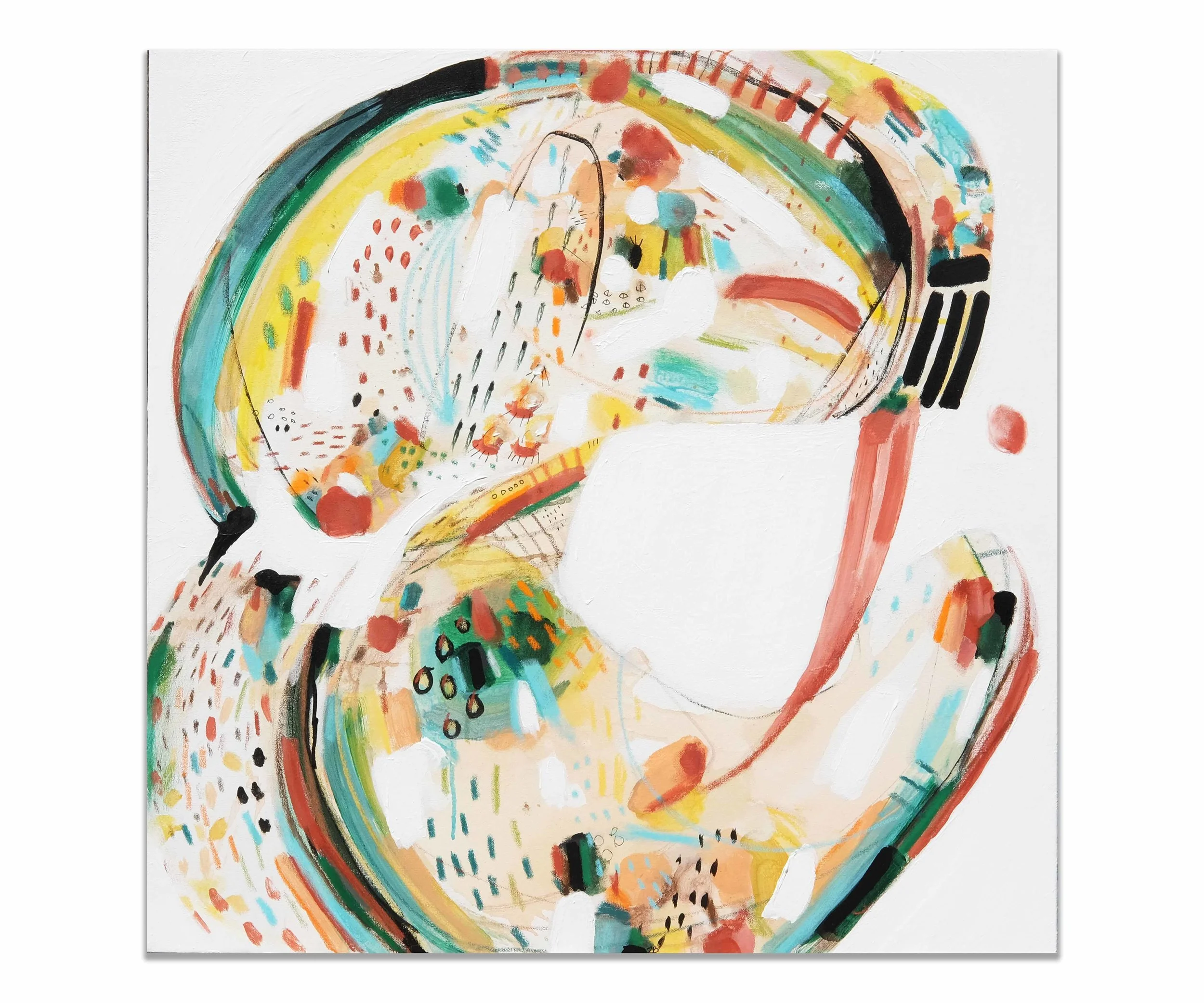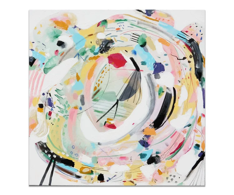 Les espaces négatifs, prenant place parmis des éclats de couleurs vives, arrivent spontanément et viennent définir les formes se retrouvant au coeur des oeuvres, celles-ci de plus en plus organiques, vivantes, éclatantes. "Rencontre" est également fortement inspirée de différents séjours de travail et d'expériences en nature, capturant ainsi dans ma pratique une variété de nouveaux paysages visuels. Grâce à ces expérimentations, j'ai grandi dans mon approche avec les textures, les matières, les formes et les teintes. C'est dans cet espace de création libérateur que j'ai pu travailler mon cheminement des "Personnes" vers la "Rencontre"; autrement dit de la connaissance du soi vers autrui.