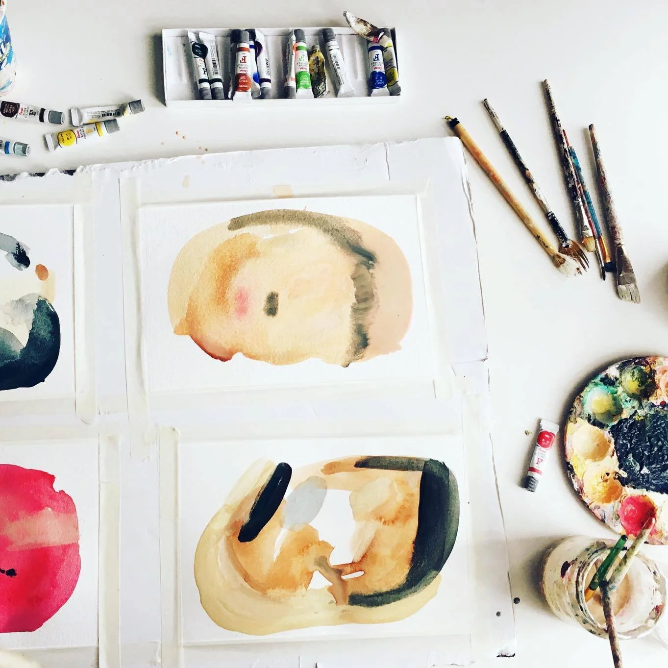 Cette première série d'oeuvres marque le processus d'exploration et d'affirmation de ma pratique artistique à travers les différentes matières et compositions utilisées. Dans l'objectif d'approfondir le thème de l'identité par l'expression émotionnelle, j'ai travaillé cette série de toiles à l'image des différents visages, âmes, énergies et émotions des êtres vivants qui m'entouraient au moment de la création des différentes pièces.